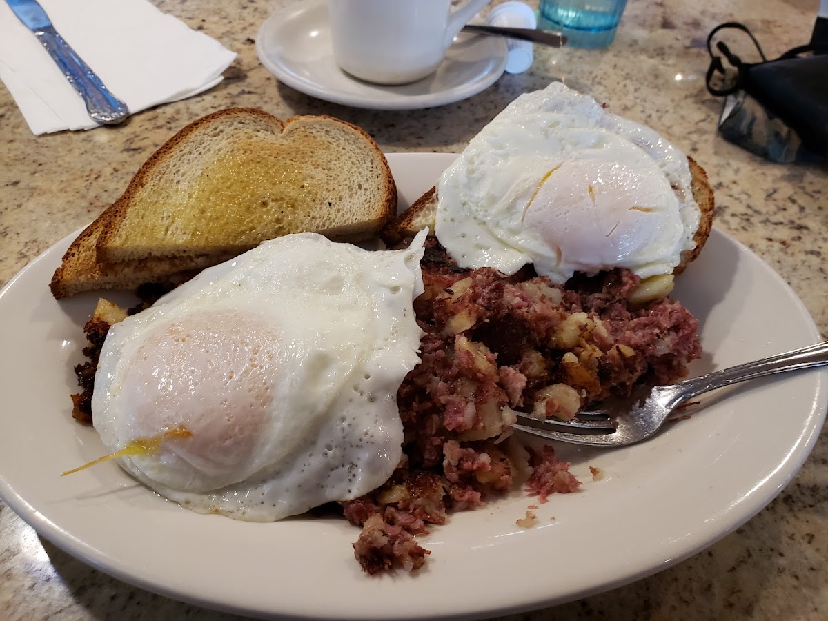 Over Easy Eggs with Bacon and Toast and Home Fried